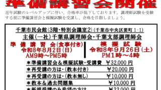 高い合格率、豊富な講師陣、伝統ある千葉支部調理師会はあなたの「資格取得」のためにお手伝いをさせていただきます。充実した講師陣:(公社)千葉県栄養士会・(公社)千葉県食品衛生協会・(一社)千葉県調理師会の現役で活躍中の講師のきめ細やかな授業が行われます。合格を確実なものとするために、受験準備講習会を受講しましょう。